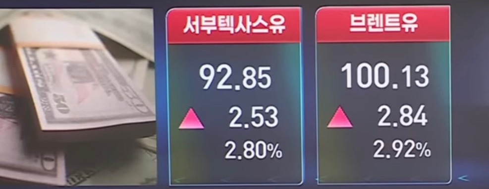 뉴욕상업거래소에서 5월 인도분 서부텍사스산원유(WTI) 가격은 전장 대비 4.16달러(+4.61%) 급등한 배럴당 94.48달러에 마감했음. 런던ICE선물거래소에서 국제유가 기준유인 브렌트유 5월물은 5.66% 급등하며 배럴당 108.01달러로 치솟았음.
